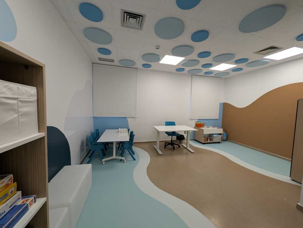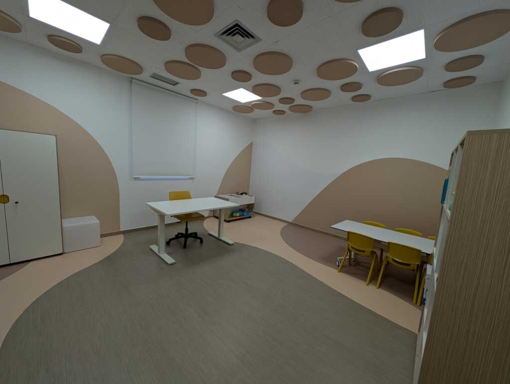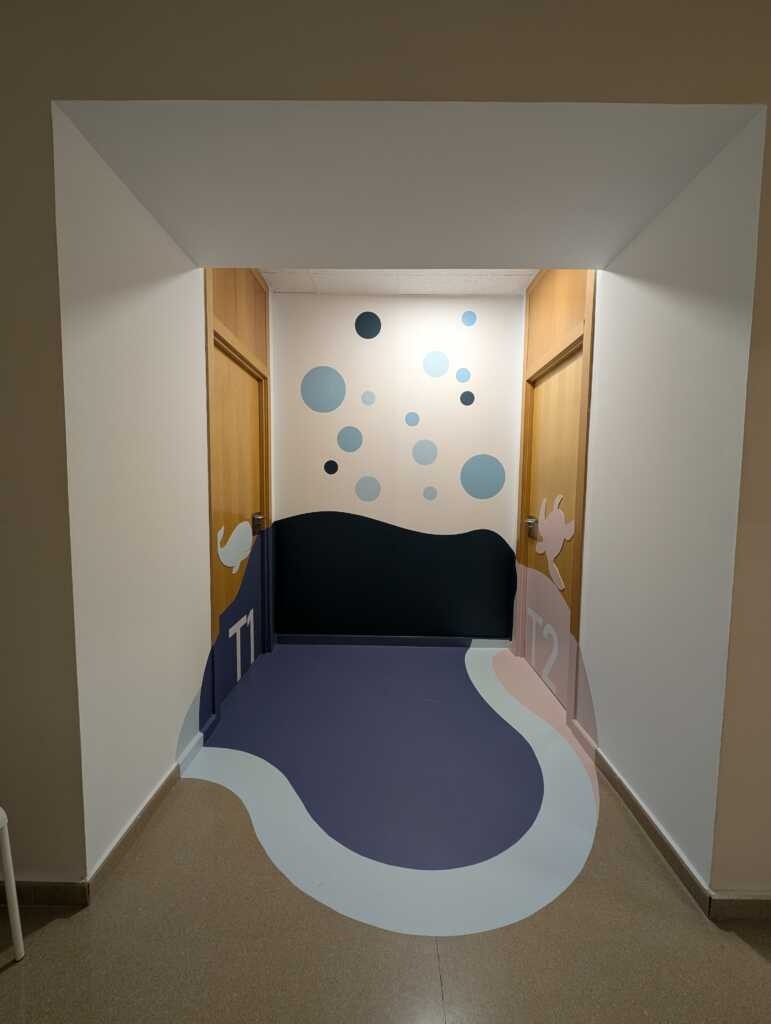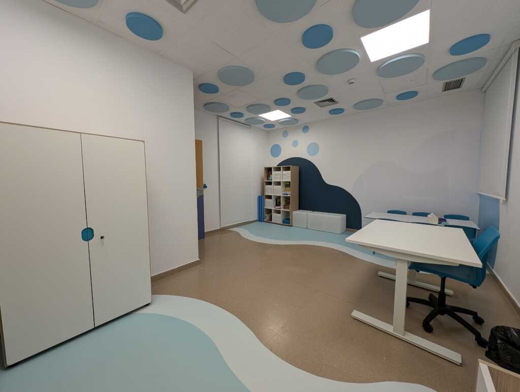 Entre las actuaciones realizadas, destacan la instalación de vinilos decorativos que acompañan el recorrido hasta las salas, creando un entorno visualmente agradable y coherente. Asimismo, se han colocado paneles fonoabsorbentes en el techo, una mejora esencial para reducir el ruido exterior. Las personas dentro del espectro autista pueden presentar una menor tolerancia a las vibraciones sonoras, y los sonidos de fondo, incluso cuando son muy bajos, pueden generar distracciones o provocar reacciones negativas que van desde alteraciones del comportamiento hasta episodios de gran ansiedad. Por ello, la reducción del ruido ambiental es clave para garantizar un entorno terapéutico adecuado.
