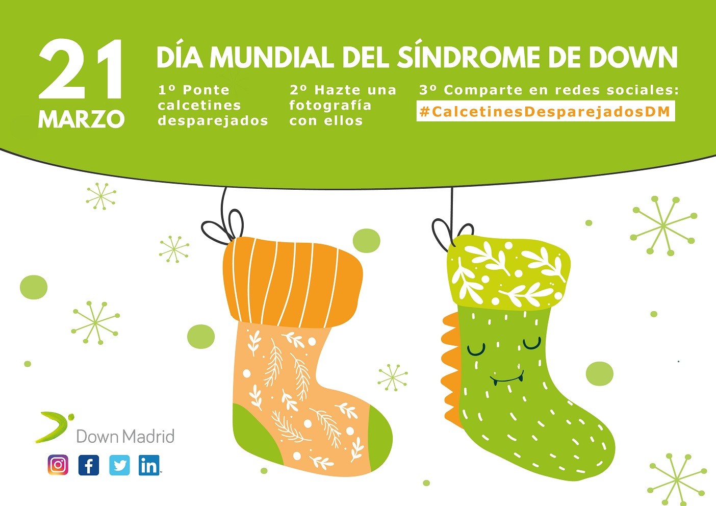 El 21 de marzo, Día Mundial del Síndrome de Down: ponte los calcetines desparejados, hazte una foto o vídeo y súbelo a las redes sociales con el hashtag #CalcetinesDesparejadosDM