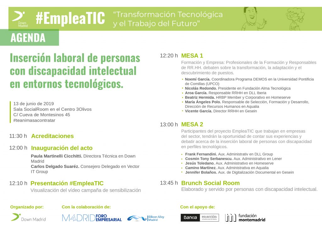 EmpleaTIC es un proyecto de la Fundación Síndrome de Down de Madrid que apuesta por a inserción laboral de personas con síndrome de Down u otra discapacidad intelectual en entornos o puestos tecnológicos. La robotización del mercado laboral y las nuevas tecnologías están haciendo desaparecer ciertos puestos de trabajo, pero también están generando nuevas oportunidades de empleo para todos. Necesitamos reinventar el mercado laboral adaptando estas nuevas demandas a las posibilidades de las personas con discapacidad intelectual.