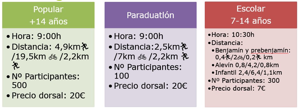 - Para hacerlo dejamos previamente la bici en un espacio controlado que llamamos “Transición”. Todos salimos corriendo desde la salida para llegar a la zona de transición donde nos pondremos el casco y cogeremos la bici para hacer un nuevo tramo en bici de montaña. Regresaremos de nuevo a la zona de transición para dejar la bici y correr hasta llegar a la meta.