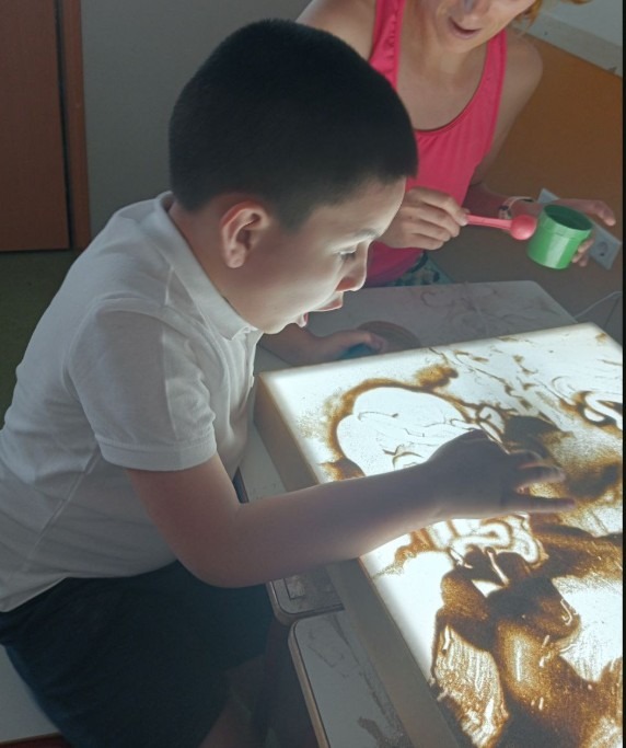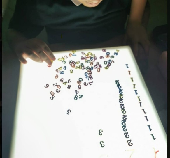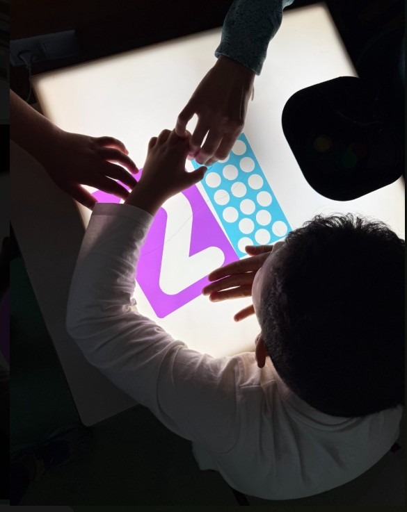 Algunas de las actividades que realizamos con la mesa de luz son la clasificación de piezas por colores o formas, trazos sencillos sobre arena o plantillas transparentes, pequeñas construcciones translúcidas y la observación de elementos naturales que, al iluminarse, muestran detalles que facilitan la comprensión y despiertan la curiosidad.
