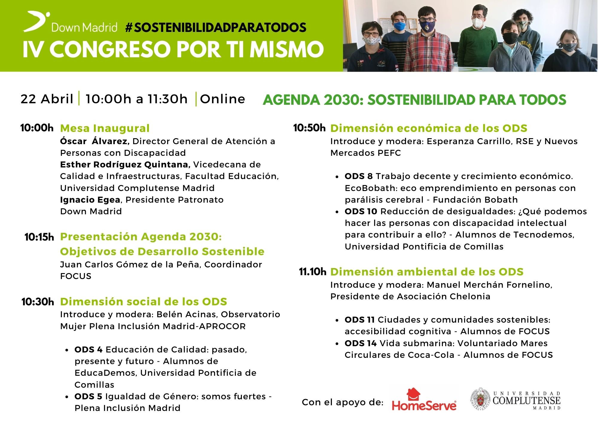 El congreso contará con tres mesas redondas, ‘Dimensión social de los ODS’, ‘Dimensión económica de los ODS’, y ‘Dimensión ambiental de los ODS’, en las que los alumnos de los diferentes programas educativos de Down Madrid y otras organizaciones expondrán sus proyectos y reflexiones sobre distintos temas de interés actual en los que llevan trabajando meses. Las ponencias contarán con la participación de expertos de Plena Inclusión, Fundación Bobath y Coca Cola.