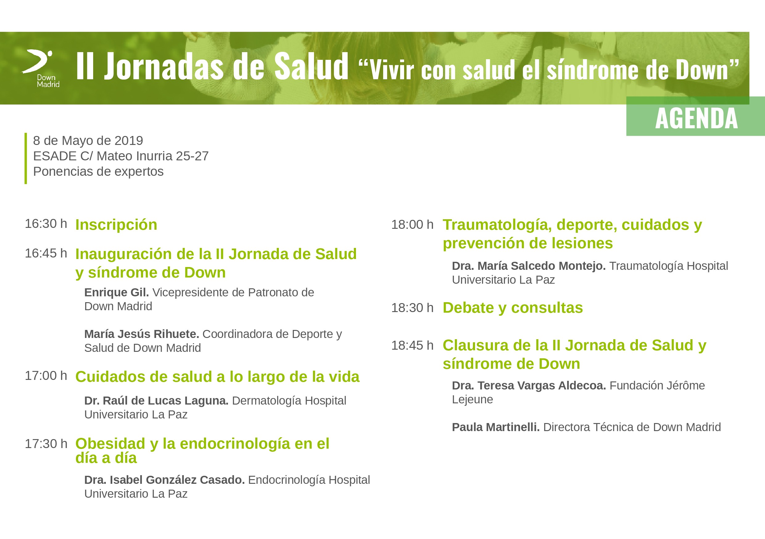 Down Madrid te invita a las II Jornadas de salud y síndrome de Down el próximo 8 de mayo a las 16.30h en la sede de ESADE (calle Mateo Inurria 25-27, Madrid) en la que se tratarán los temas que más te preocupan como familiar de una persona con síndrome de Down.