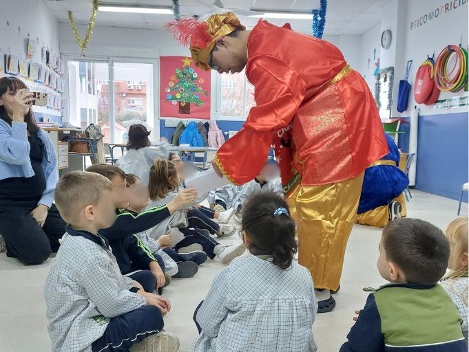 Desde primera hora de la mañana, el ambiente en el colegio era de emoción y nervios. Los niños aguardaban impacientes la llegada de los Pajes, que aparecieron con sus trajes llenos de color y espíritu navideño. Al entrar en cada clase, fueron recibidos con aplausos, risas y miradas llenas de sorpresa. Para muchos, era la primera vez que entregaban su carta en mano a los ayudantes de Sus Majestades, lo que convirtió el momento en una experiencia inolvidable.