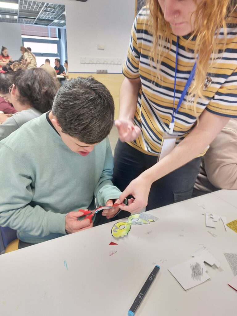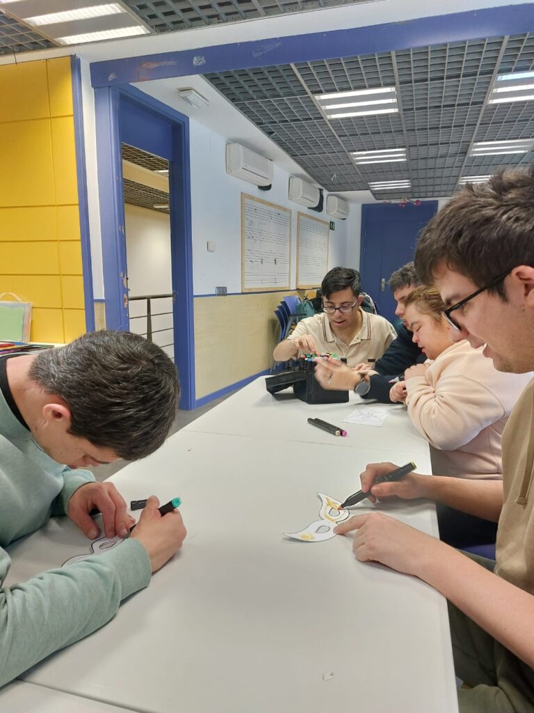 Los participantes de los programas OcúpaT e IníciaT del Centro Ocupacional de Down Madrid han disfrutado esta semana de un dinámico taller de máscaras de carnaval organizado en el Centro Juvenil Hontalbilla, un espacio municipal que mantiene una estrecha colaboración con diversos servicios de Down Madrid. La actividad se enmarca en las iniciativas que ambas entidades desarrollan de manera conjunta para promover la inclusión real de personas con discapacidad intelectual en los recursos comunitarios del distrito de Fuencarral-El Pardo.