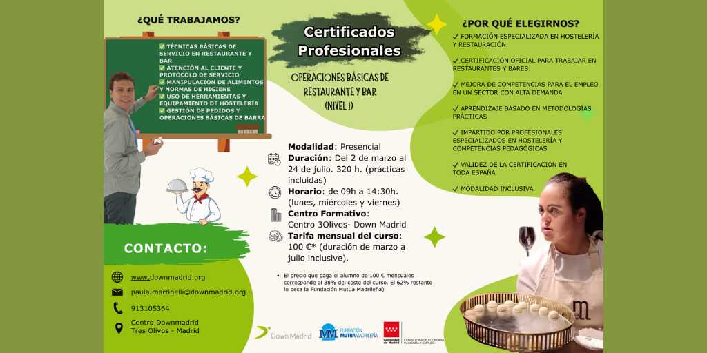 Certificado Profesional de Operaciones Básicas de Restaurante y Bar (nivel 1) En Down Madrid reforzamos nuestro compromiso con la inclusión laboral...
