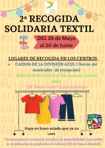 Con mucha ilusión queremos invitaros a la “Segunda recogida solidaria de textil” proyecto de Aprendizaje Servicio organizado desde el Servicio de Empleo y en el que están implicados participantes de la agencia de colocación y grupo de capacitación de Serpais Este. Se celebrará durante las próximas semanas desde el 26 de mayo, al 20 de junio en los distintos centros de Down Madrid: 3 Olivos, Colegio María Isabel Zulueta, Caídos. Para poner en marcha esta actividad, vamos a necesitar de vuestra colaboración aprovechando el cambio de armario … Esta actividad nos permite desarrollar una actividad de economía circular, dando una segunda vida a esta ropa y tejidos, ya que servirán para reutilizarla en los productos elaborados en “Achira: Centro Especial de Empleo de Down Madrid” y donación a ONGs.