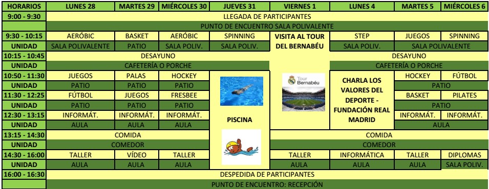 La Semana Deportiva estará dividida entre actividades deportivas individuales, de equipo, lúdicas, etc., talleres, informática y una visita fuera de la instalación a visitar el Tour del Bernabéu. Además, también iremos un día a la piscina. En relación a las actividades deportivas realizaremos actividades regladas y no regladas como baloncesto, fútbol sala, pilates, spinning, etc, buscando la máxima diversión de todos los participantes.