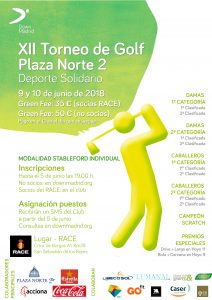 El Complejo Deportivo del RACE acogerá, los próximos días 9 y 10 de junio, la duodécima edición del Torneo de Golf Plaza Norte 2. Este torneo cuenta con la colaboración principal de Plaza Norte 2, RACE, Acciona, Estrella Damm y Coca Cola. Además, colaboran también Alliance Vending, Caser Seguros, Global Golf, Gredos San Diego, Go Fit, Ibecosol, IEB, Lumanai