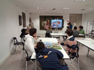 Después nos han enseñado tres cuadros del Museo que no conocíamos como el Paseo del Prado (el mismo que se ve desde la Puerta Murillo hace muchos años), la Laguna de Venecia y los Picos de Europea, para reflexionar sobre las consecuencias de la acción humana, la urbanización y las fábricas y colaborar con la justicia medioambiental para ser ciudadanos/as responsables, como nos enseñan los Objetivos de Desarrollo Sostenible 3, 11 y 12 y 13.